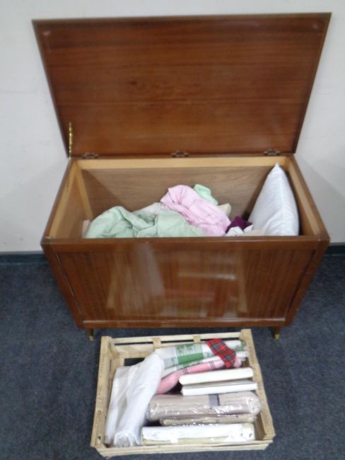A mid 20th century blanket box containing assorted bed linen, table linen, pillows, tea towels etc