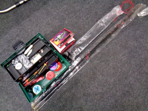 A box containing fishing equipment to include a concertina box containing fishing weights, lures and line, a two piece fishing rod, landing net, reels