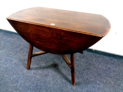 An Ercol solid elm and beech drop leaf table and four Ercol rail back dining chairs
