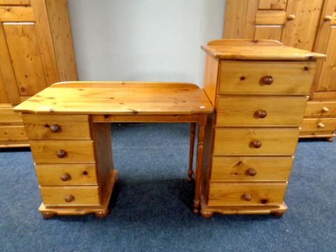 A pine single pedestal four drawer dressing table together with a narrow pine five drawer chest