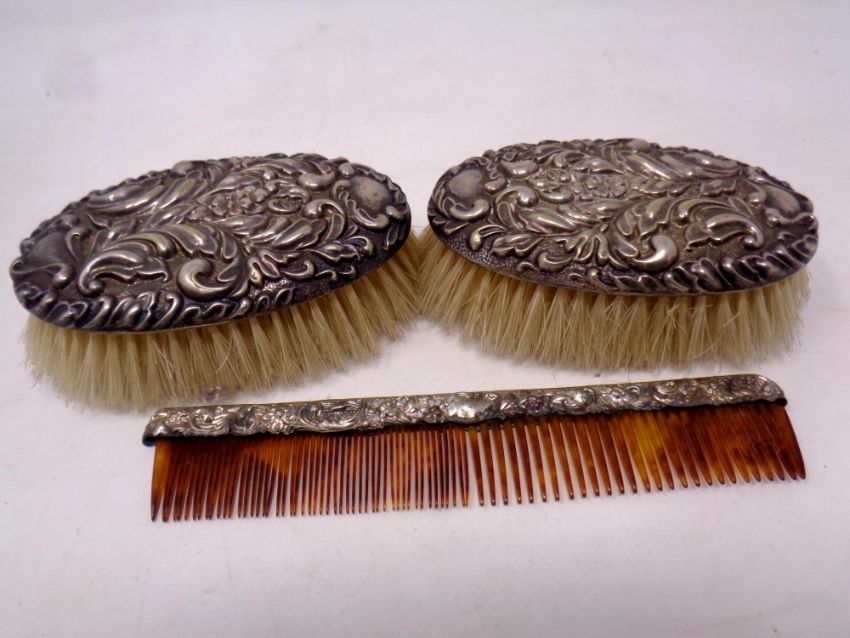 Two silver backed brushes and a silver mounted comb