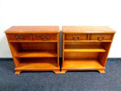 A pair of inlaid yew wood open bookshelves fitted two drawers above, width 75.5 cm