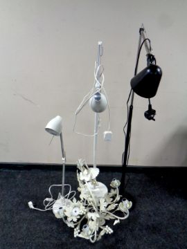 Two contemporary angle poise floor lamps together with an angle poise table lamp and a metal chandelier with leaf decoration