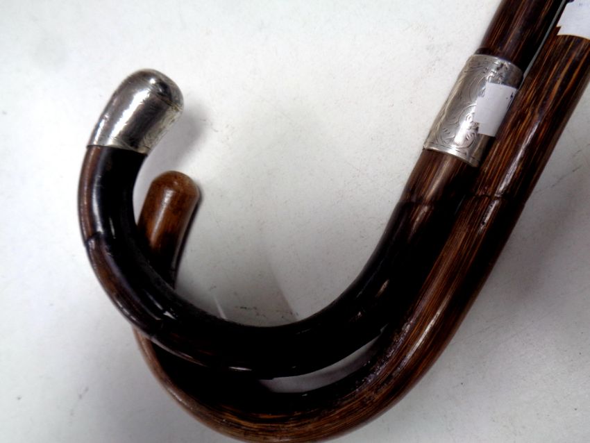 Two vintage walking canes, one with silver mounts