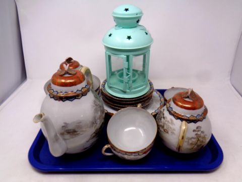 A tray containing fifteen pieces of Japanese eggshell tea china together with a metal tea light holder