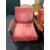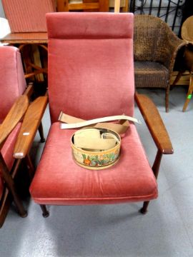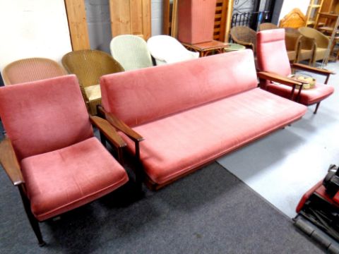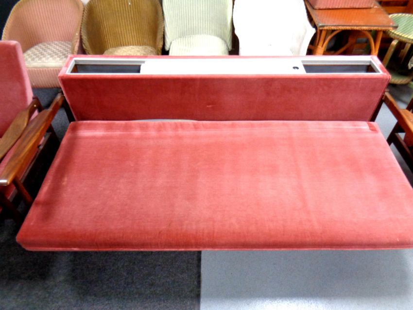 A Guy Rogers 'Manhattan' teak framed three piece lounge suite comprising of day bed with tilting back rest incorporating storage cupboard, armchair and adjustable armchair, upholstered in a pink dralon. (3)