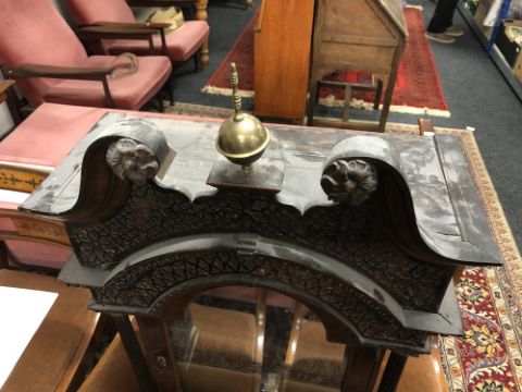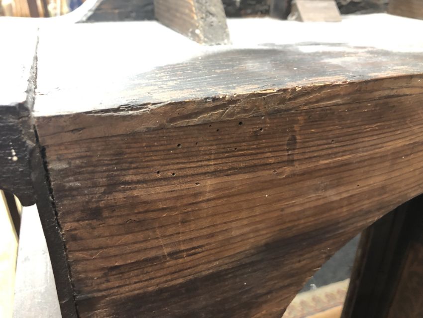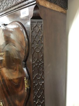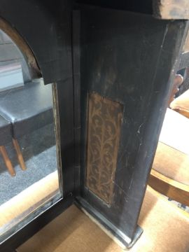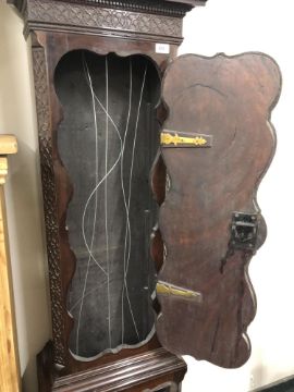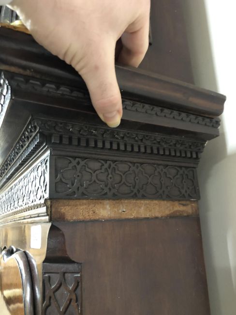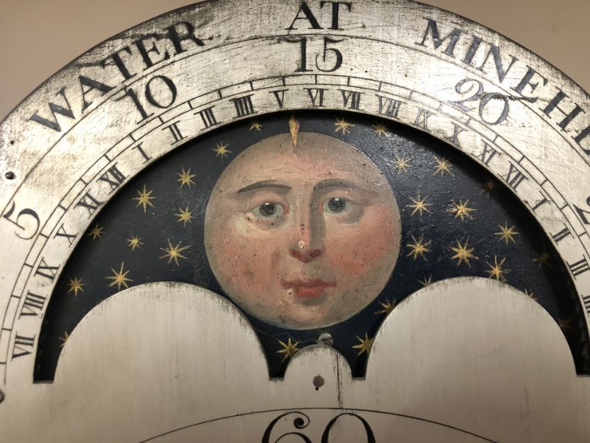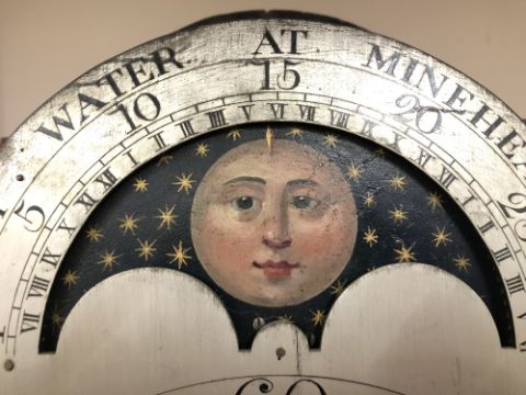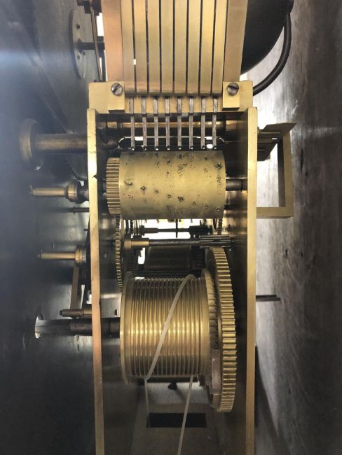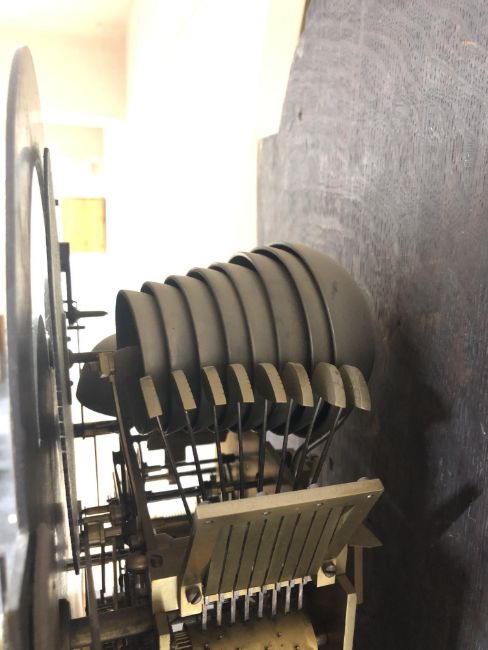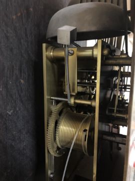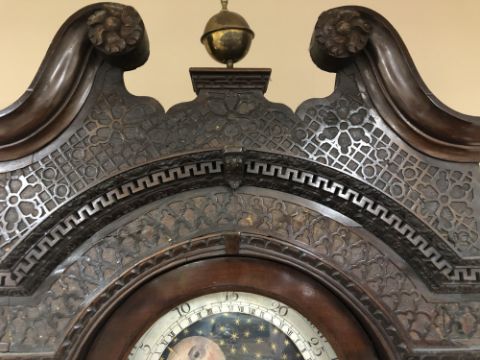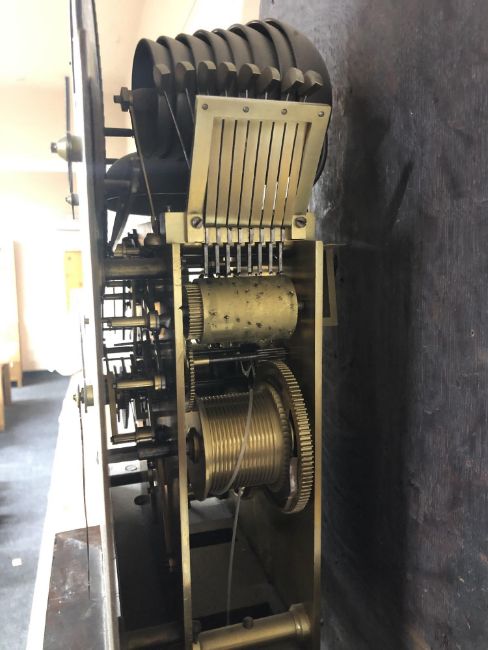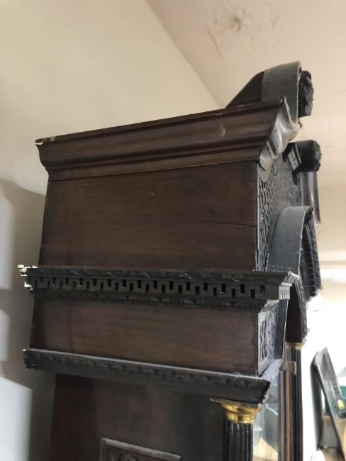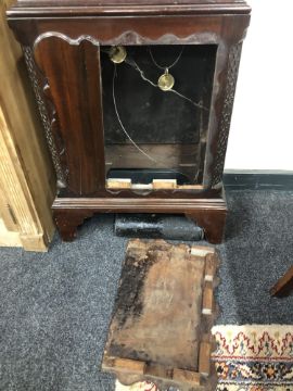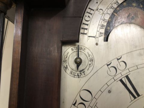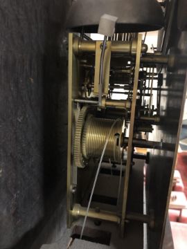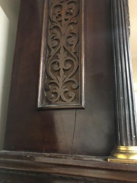 There is a split to the lower case which has gone all the way through the panel, splitting it in two. There are natural cracks forming to parts of the clock including the door escutcheon, sides of hood etc. There is a section of moulding detached from the right side of the case beneath the hood, the piece is present. There is another thinner strip of moulding beneath this which is missing. There are old repairs and some small losses to the fretwork and dentil moulding around the hood. There is some old worm damage visible to the back of the hood. The movement appears to have been refurbished at some point with modern nylon strings added. There is no winding key present. This has not been tested within the saleroom. This is 254cm high by 55cm wide by 29cm deep. See images.