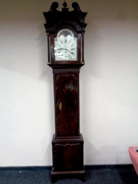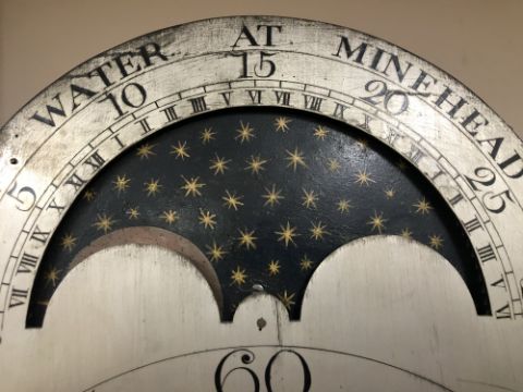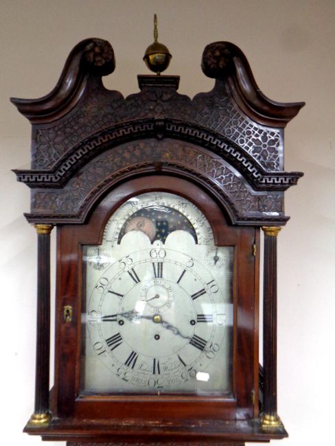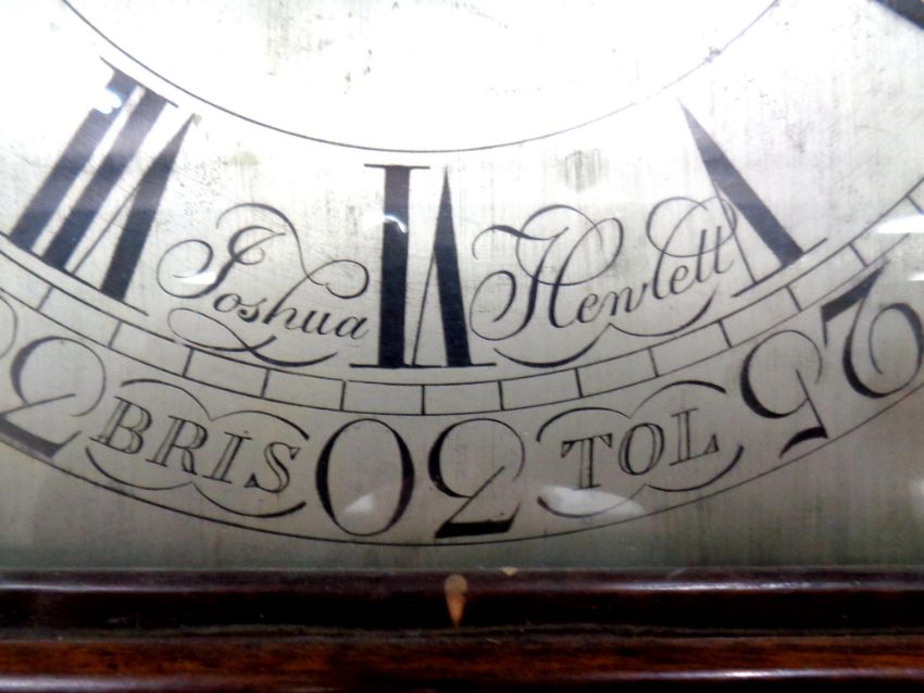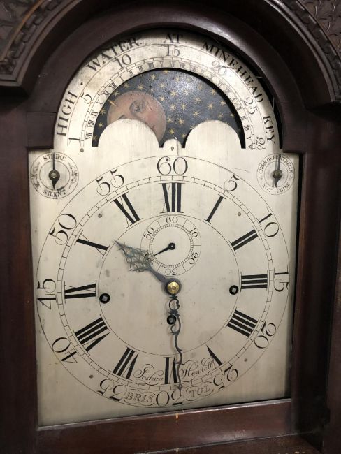 A fine 18th century longcase clock by Joshua Hewlett, Bristol. The English 8-day movement, 8-bell quarter chiming and 9th bell for hours, flat silvered, engraved brass dial, Roman numerals to chapter ring, subsidiary Arabic minutes, with moon phase, tide dial to arch, blued steel hands and mahogany case with blind fretting.