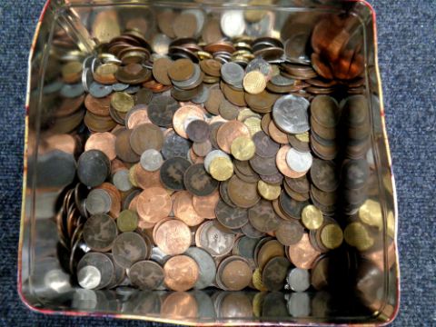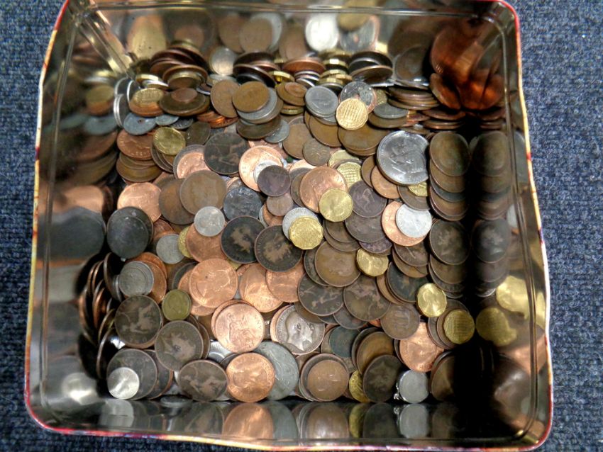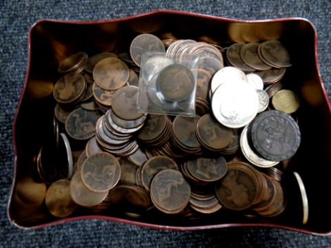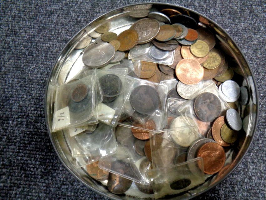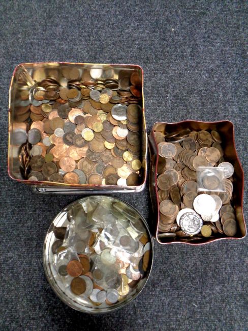 A large quantity of coins in three tins including silver Victorian and other crowns, coins going back to George II