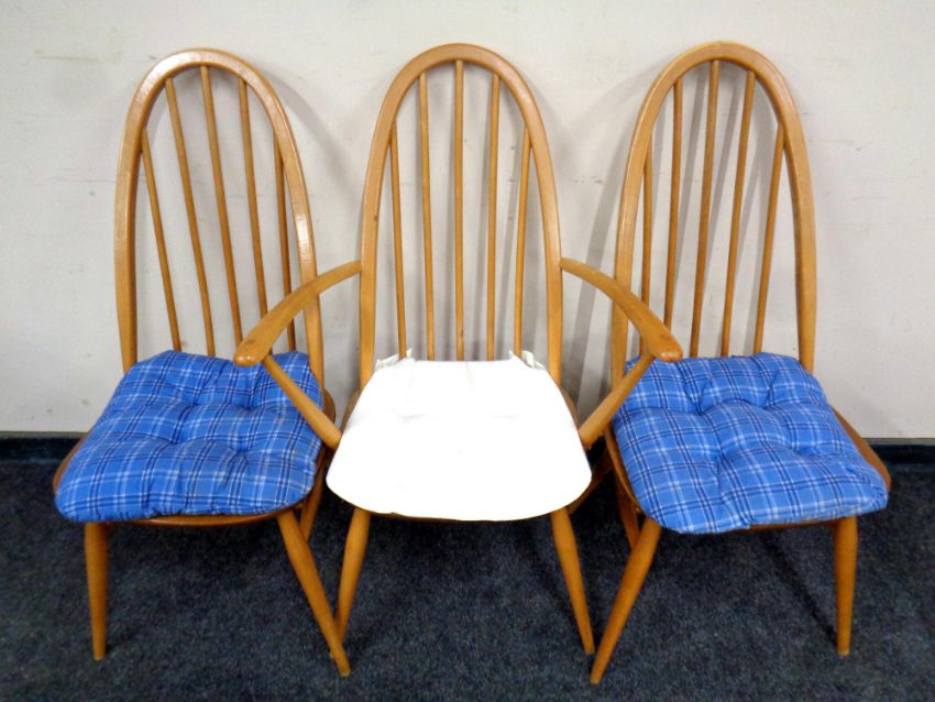 An Ercol elm and beech dining table, length 150 cm, together with a set of six high backed dining chairs, two carvers and four singles