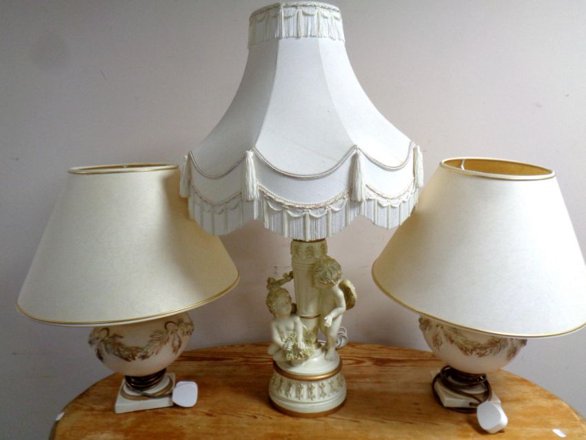 A contemporary cherub composite table lamp with tasselled shade together with a further pair of table lamps with shades
