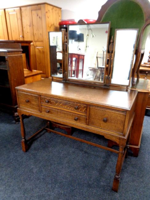 A 20th century Vesper Furniture oak dressing table with triple mirror, width 107 cm, together with matching three drawer chest, width 92 cm
