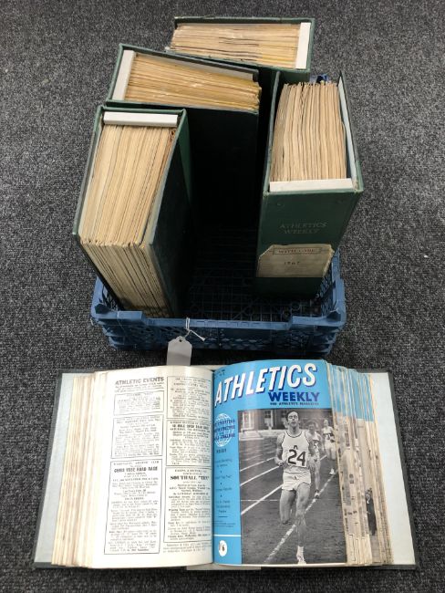A basket containing a quantity of 1960s Athletics Weekly magazines in five folders