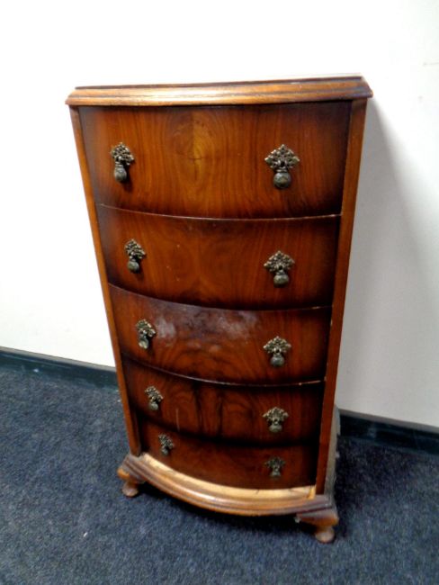 A walnut bow fronted narrow five drawer chest, width 45 cm