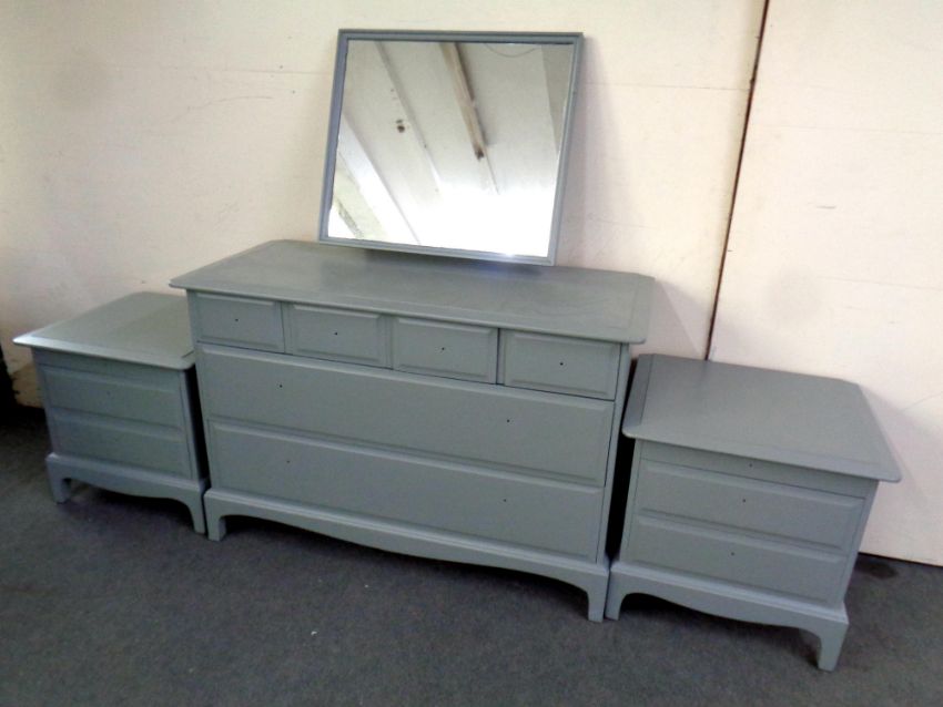 A Stag Minstrel six drawer dressing chest and a pair of two drawer bedside chest (painted) no handles