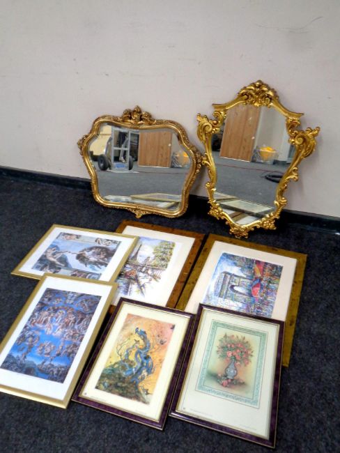 A box containing two ornate gilt framed mirrors together with six further framed prints