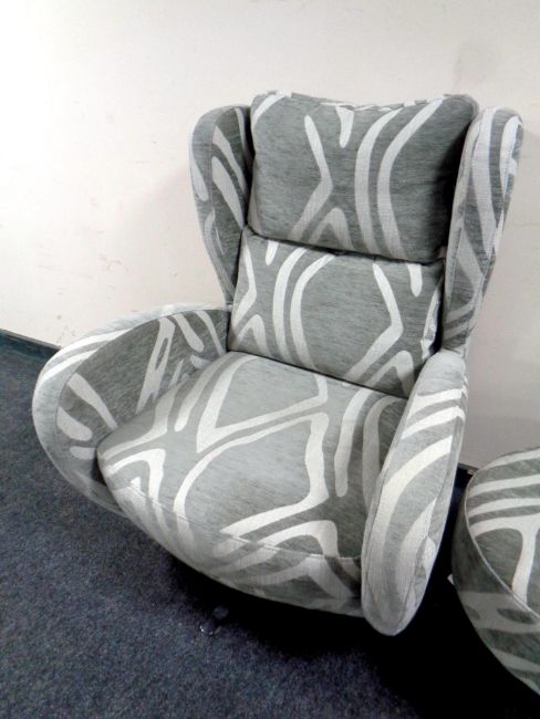 A pair of Fama zebra print wingback adjustable armchairs on chrome bases together with a matching circular footstool
