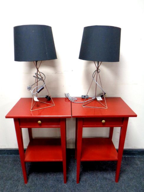 A pair of contemporary painted two tier bedside tables fitted drawers together with a pair of contemporary table lamps with shades