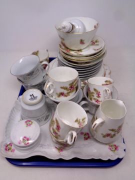 A tray containing 18 pieces of 19th century hand painted china together with further mandarin china cups and saucers, and a part china trinket set