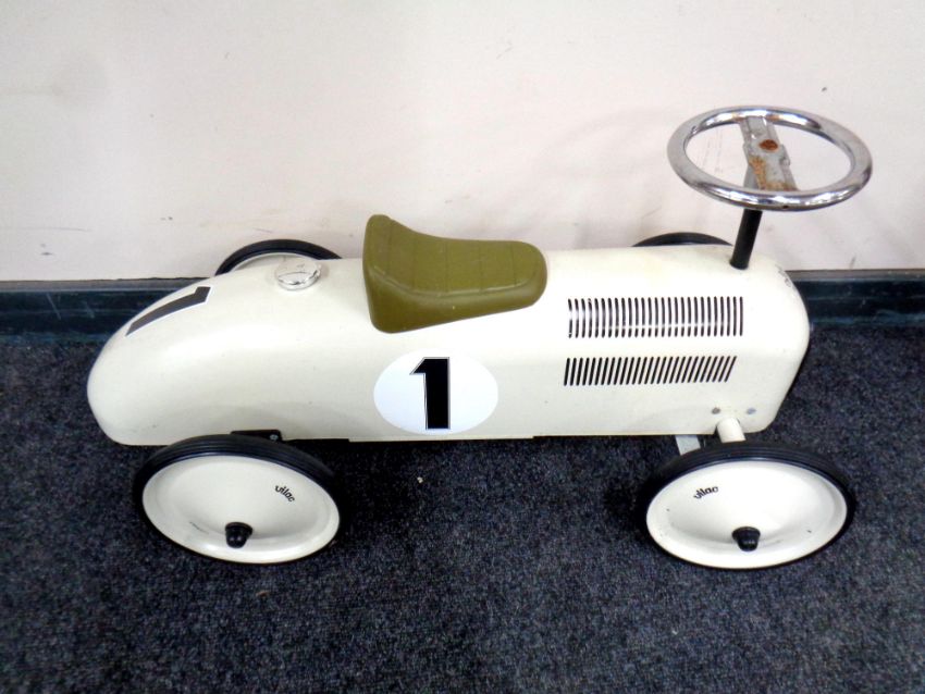 A child's tin ride on car in the form of an early 20th century racing car