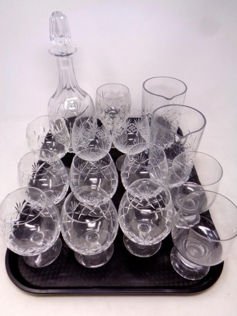 A tray containing assorted glassware to include two cut glass jugs, liqueur decanter with stopper, brandy glasses