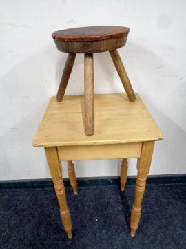A stripped pine square topped occasional table together with a milking stool