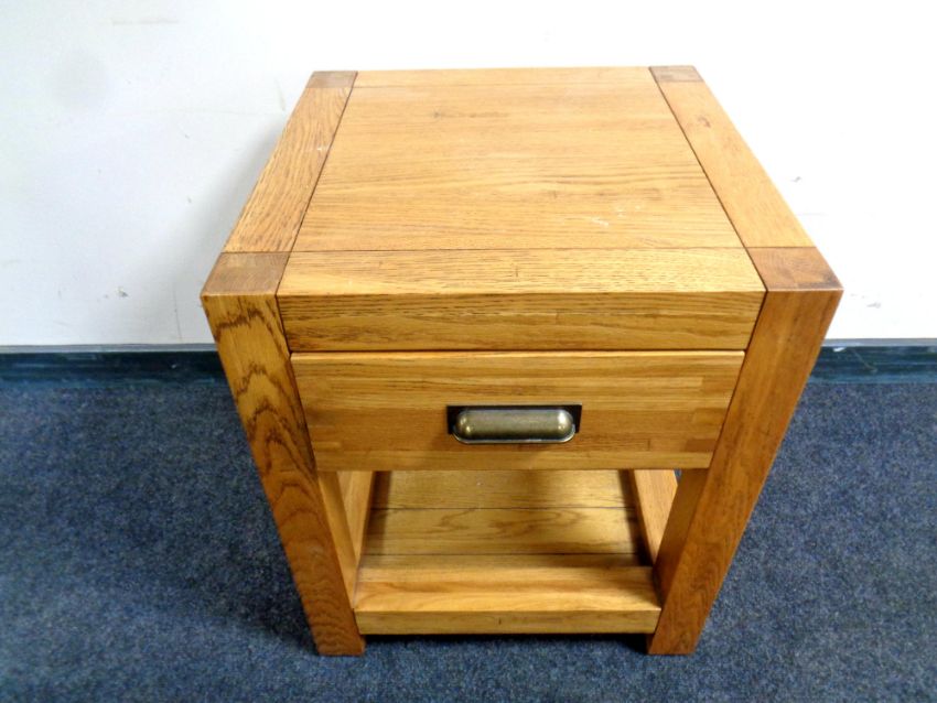 A contemporary oak two tier lamp table fitted a drawer, width 50 cm