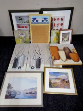 A box containing assorted contemporary pictures and prints to include an Alice Wonder 'Slender Twigs' three piece wall canvas