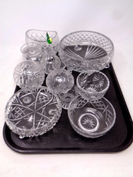 A tray containing assorted cut glass to include bowls, preserve pots, dishes, vases, together with a glass bird head cocktail stirrer