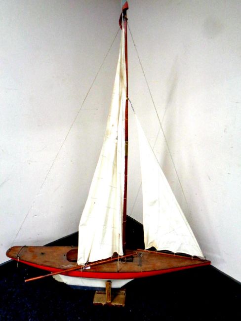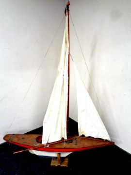 A large wooden model of a pond yacht on stand, total height 164 cm