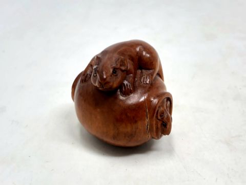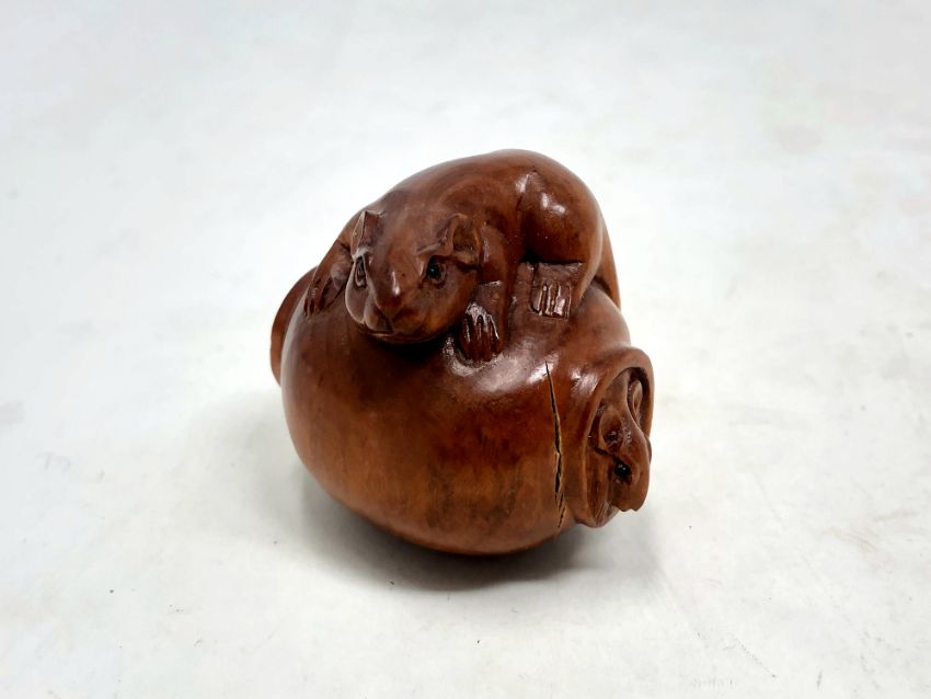A Japanese carved fruitwood netsuke - Rats on a barrel.