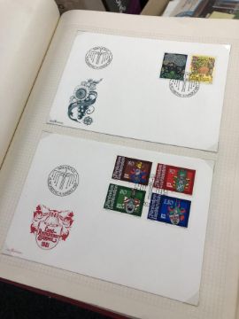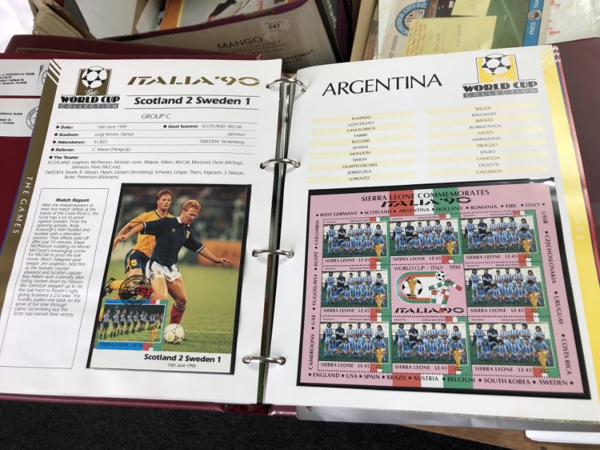 A box containing a quantity of stamp albums, albums of football world cup collection stamps etc