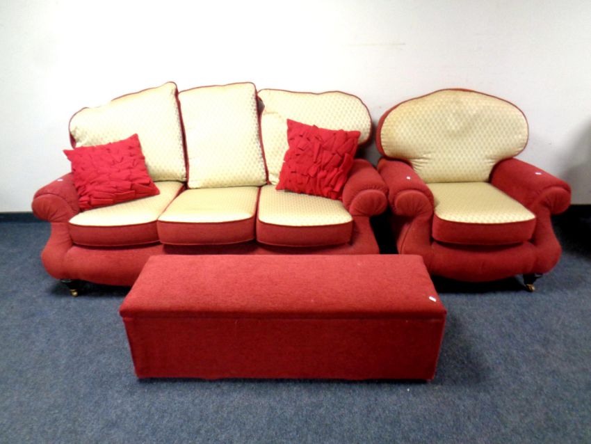 A contemporary three seater settee and armchair upholstered in a two tone fabric together with a storage Ottoman stool