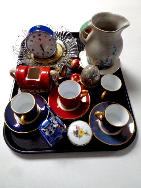 A tray containing a Smiths alarm clock, coronation glass dish, decorative egg etc