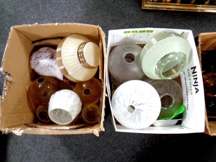 Three boxes containing 20th century glass light shades, Murano glass birds, further glass items etc