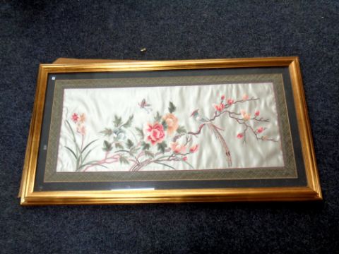 A Japanese silk embroidered panel in a gilt frame depicting a bird of paradise, width 113 cm