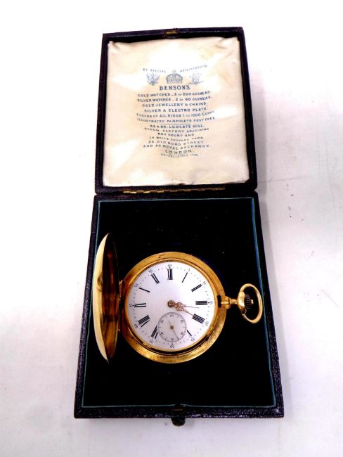 A gold plated full hunter pocket watch by J W Benson, in original case