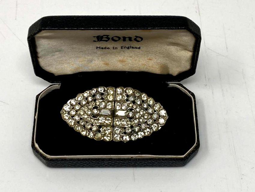An Art deco style two part clip brooch, width 5 cm.