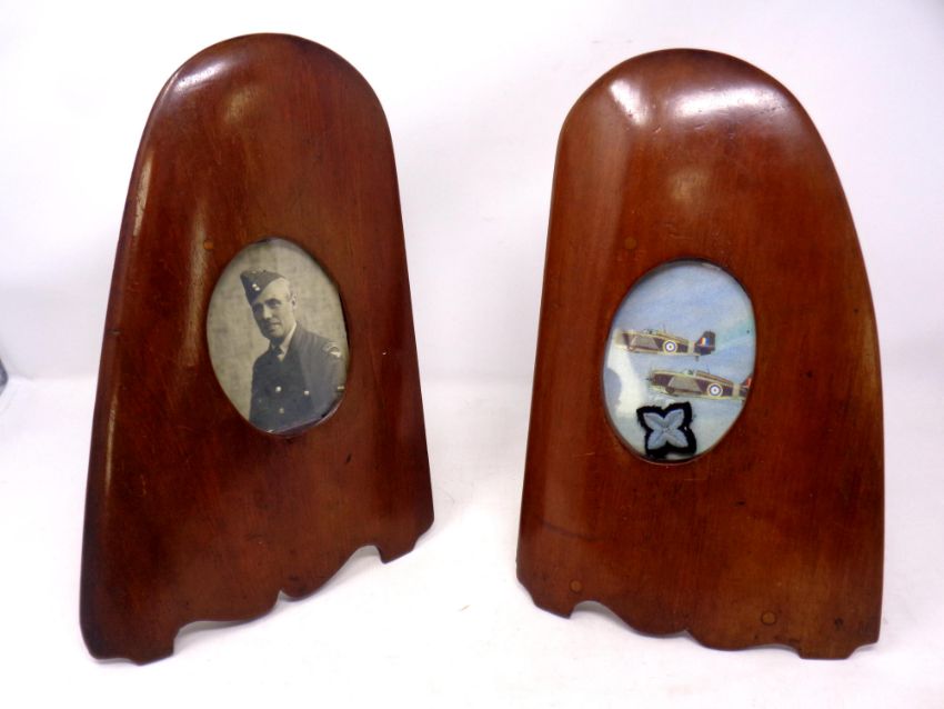 WWI Interest: Matching Pair of Great War Propeller Tip Photograph Frames, each with central oval aperture, fret cut decoration to the bottom edge and original easel stands, one frame complete with a black and white photograph of a soldier from the Royal Flying Corps, each frame 30cm high and 21cm wide