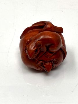 A Japanese carved fruitwood netsuke - Rats on a pumpkin.