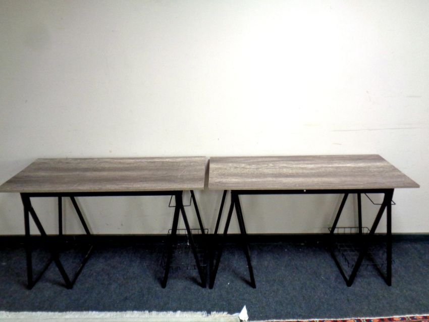Two trestle tables together with a quantity of wool blankets, camping equipment, folding chairs etc