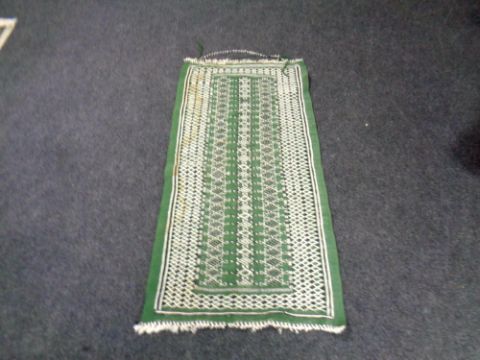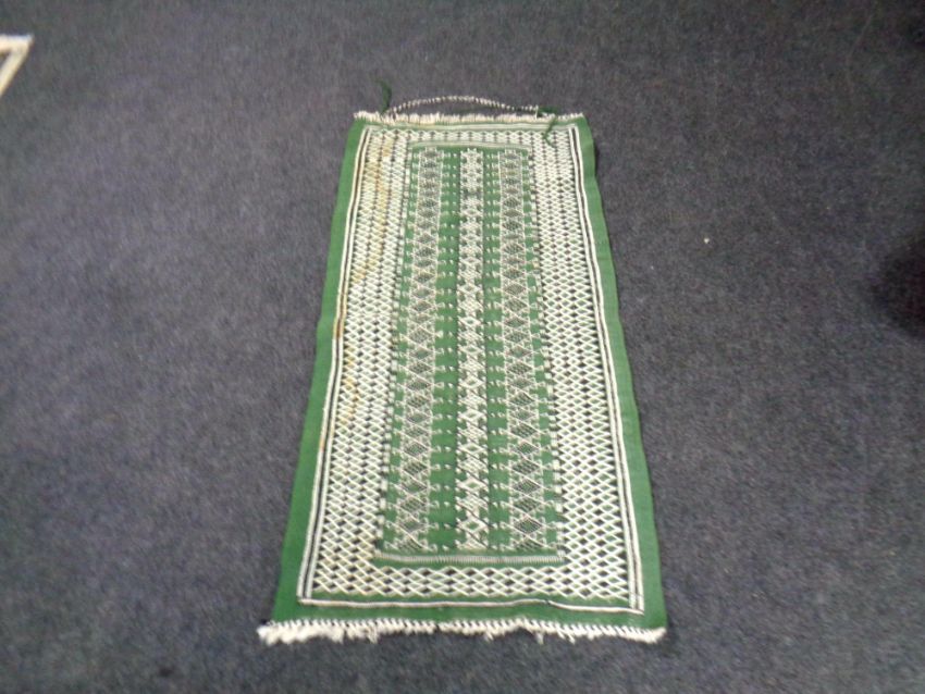 A fringed eastern rug on green ground