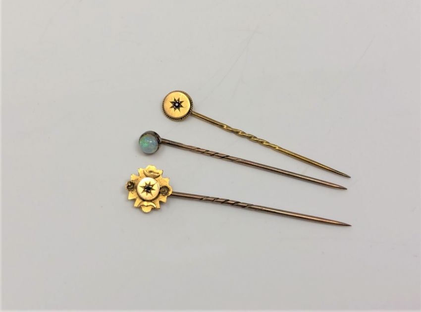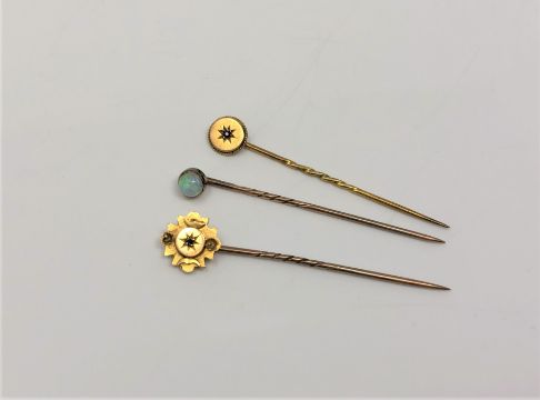 Three gold pins, two marked 15ct and set with diamond and ruby, the other unmarked and set with opal. (3)