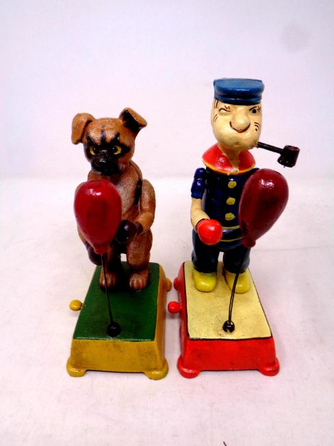 Two cast iron novelty mechanical boxers, Popeye and a dog