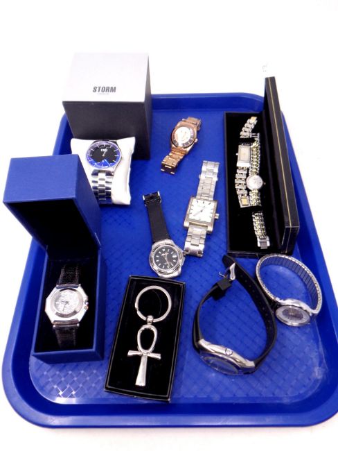 A tray containing assorted lady's and gent's wristwatches to include Storm, Swarovski, Ben Sherman etc
