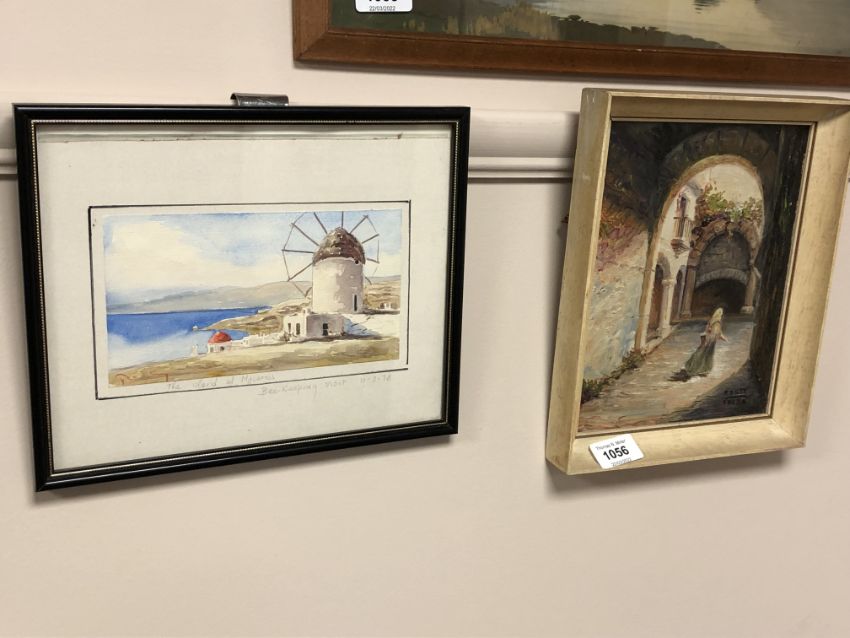 Continental school : A figure by an archway, oil on board, 17 x 22 cm, together with a watercolour drawing depicting the island of Mykonos
