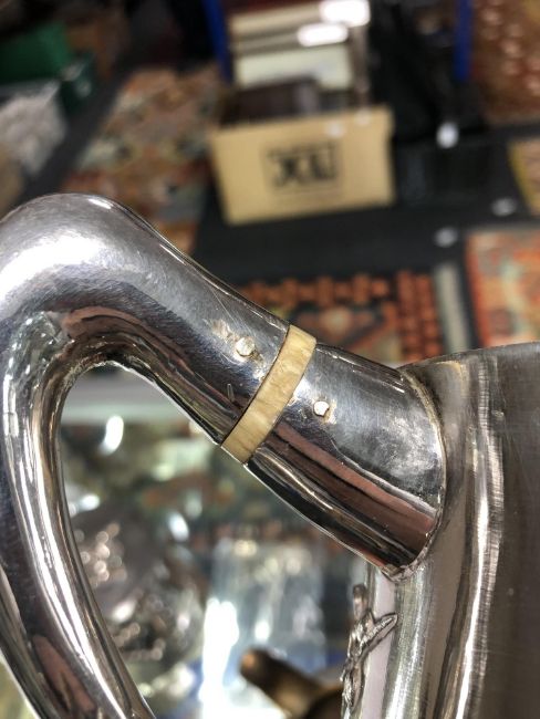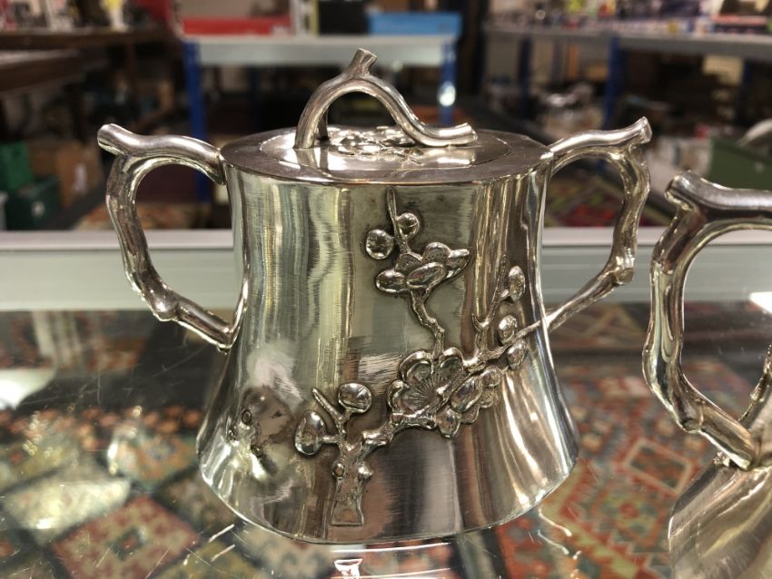 Two pieces are marked with initials 'RSV'. No further marks visible, with gilt interiors. Small bend to spout of milk jug. Pin missing from one side of top of teapot handle. Small soldered repair at the base of the teapot below the handle. See images. Otherwise good condition.