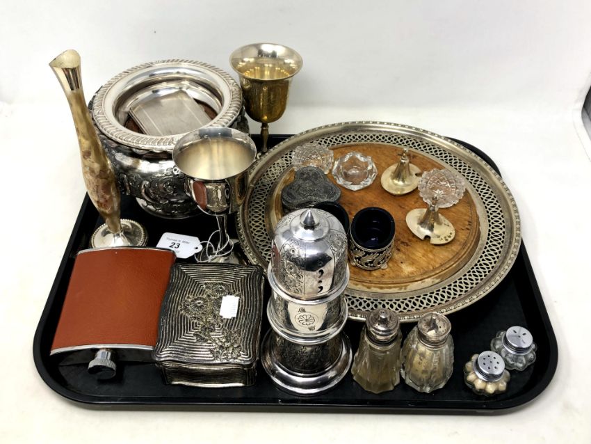 A collection of antique and later silver plated items, hip flask, cutting board, salts with glass liners, large sifter etc.