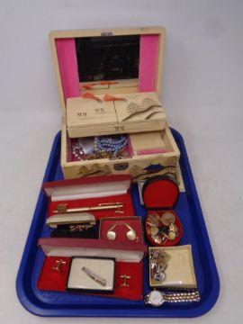A tray containing a 20th century oriental style jewellery box containing costume jewellery, lighters, gent's cuff links, cased pens etc