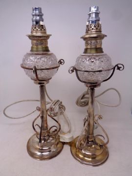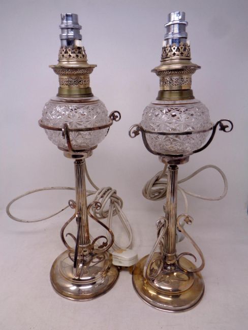 A pair of antique silver plated and cut glass oil lamps with shades (converted to electric)